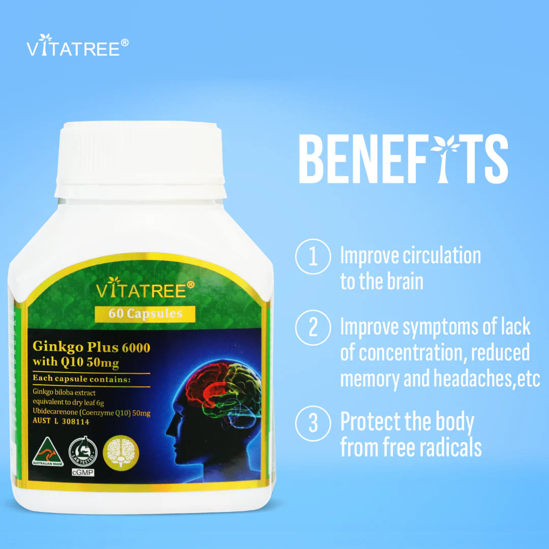 Vitatree Ginkgo Plus 6000 with Q10 50mg 60 Capsules is a unique formula combining Ginkgo extracts with CoQ10, which can help to fight against chronic fatigue, helping you to maintain vitality and provide a unique blend of Antioxidants, the most important defenses against many of the diseases of old age.
