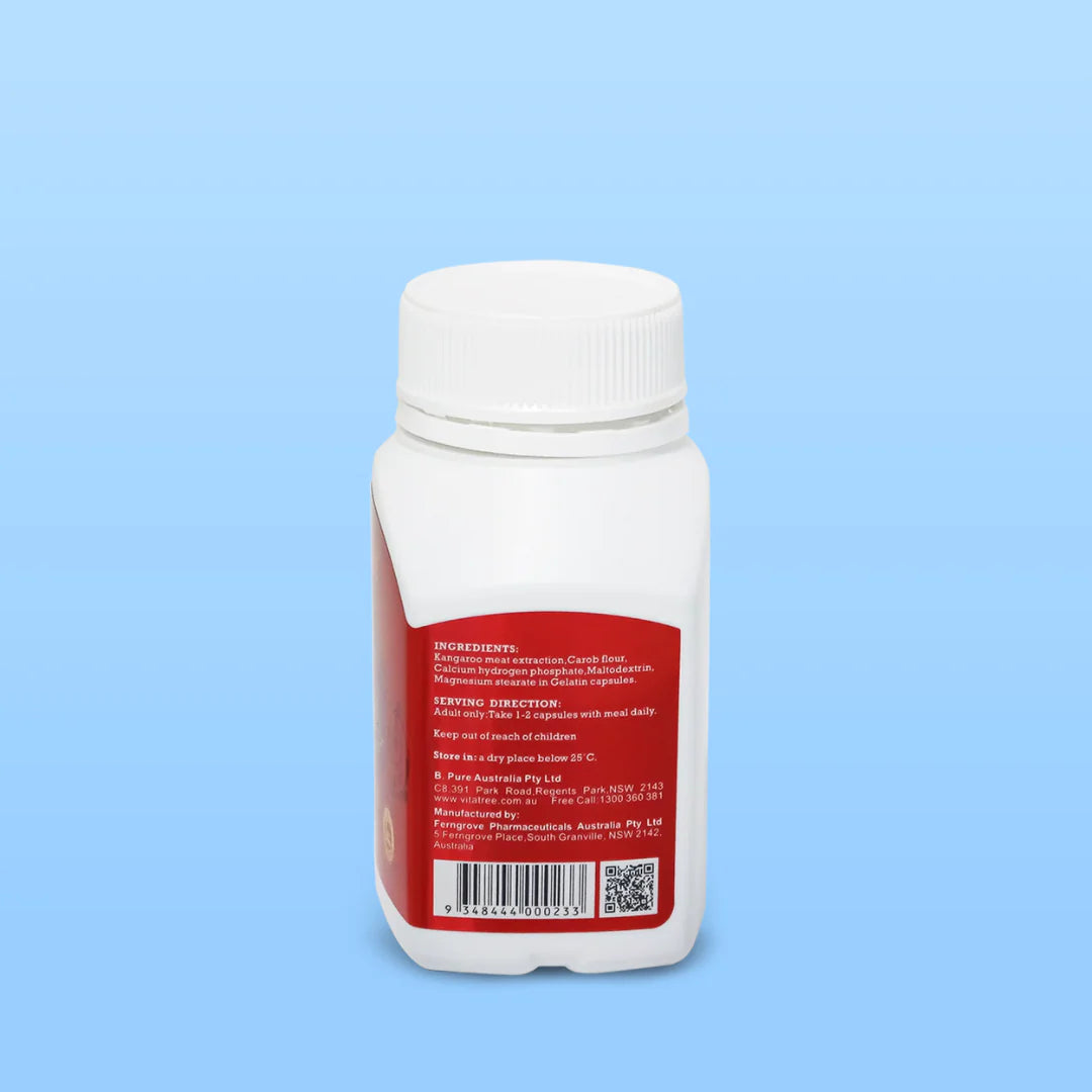 Wild Australian red kangaroos are naturally high in protein and low in fat. Vitatree Kangaroo Essence 40000 100 Capsules has a concentrated extract that amounts to having 40,000mg of Kangaroo meat, which help consumers achieve the equivalent protein by simply consuming it in the same way you would as taking a daily vitamin.