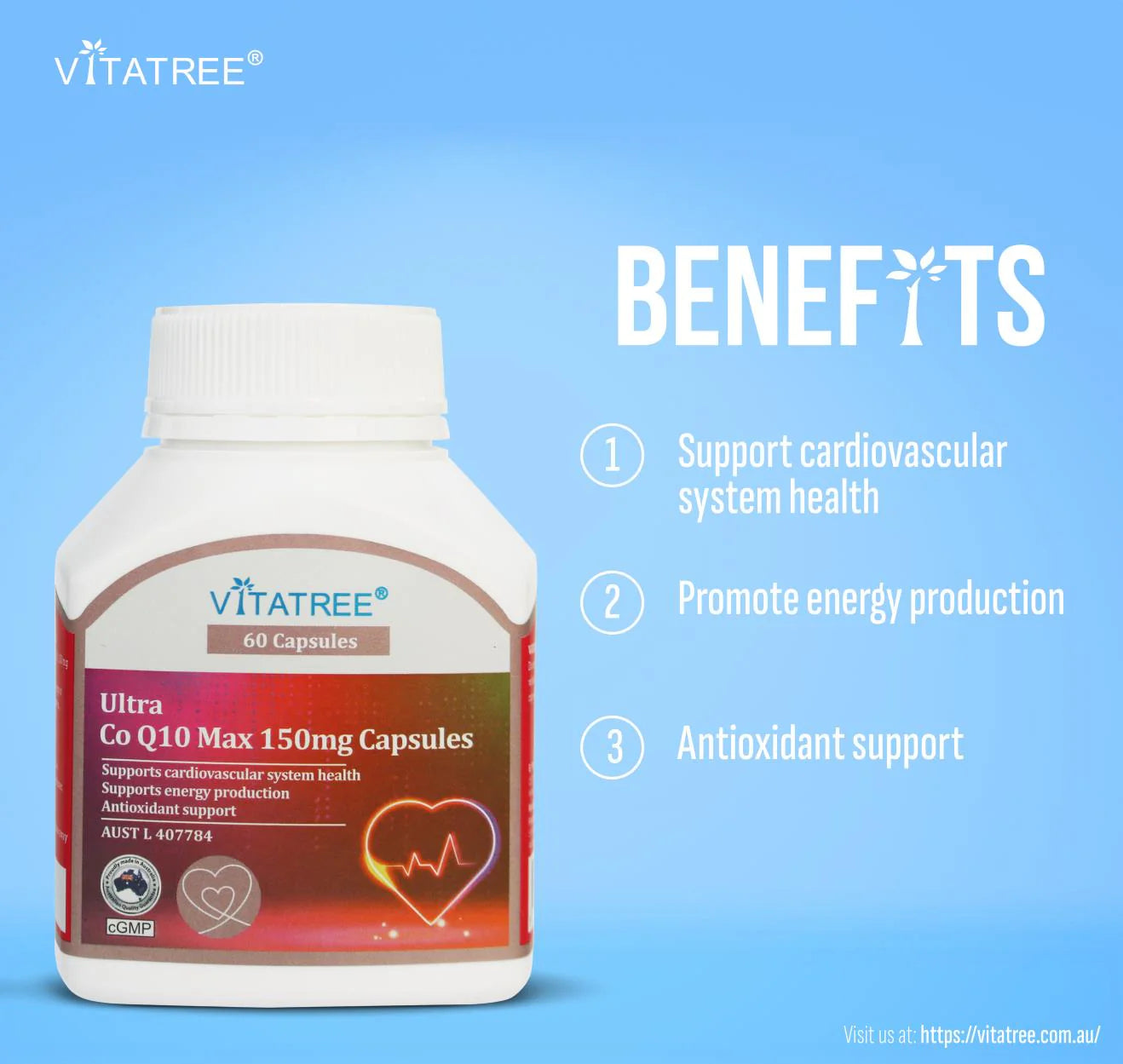 Vitatree Ultra CoQ10 Max 150mg 60 Capsules contain a potent 150mg dose of Co-enzyme Q10. Our product not only assists in heart health maintenance and the reduction of free radicals but also plays a pivotal role in bolstering overall cardiovascular well-being. Moreover, it is a key factor in supporting energy production, contributing to your overall health and vitality.